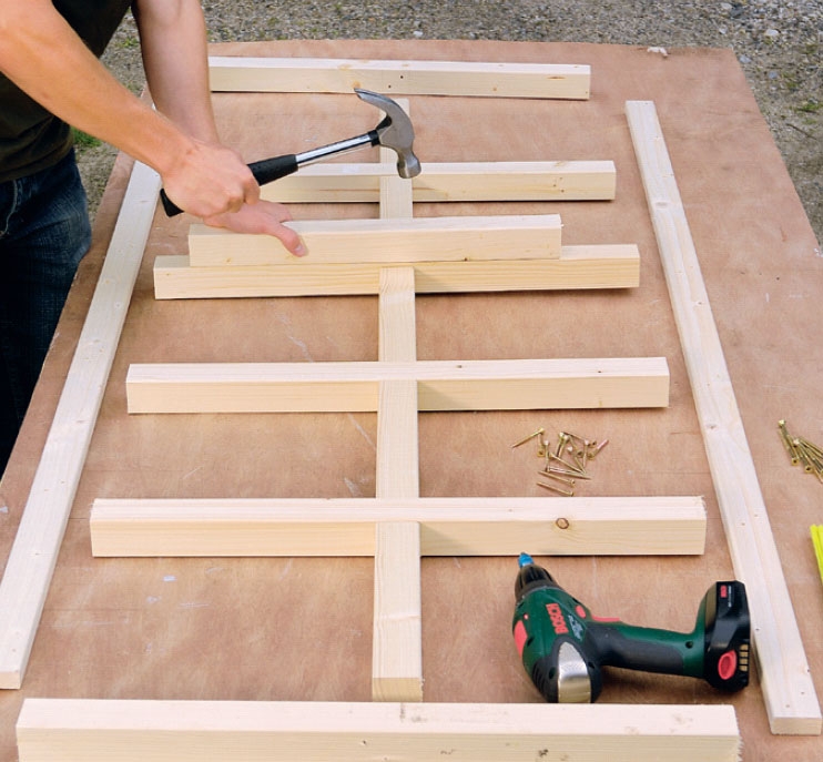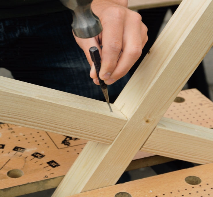 Ristiliitokset naulataan 16 x 35 mm:n sinkityillä nauloilla, jotka lyödään liitoksiin vinosti. Tämä on helpompaa kuin liitosten ruuvaaminen ja ruuvikantojen upottaminen puun pintaan.