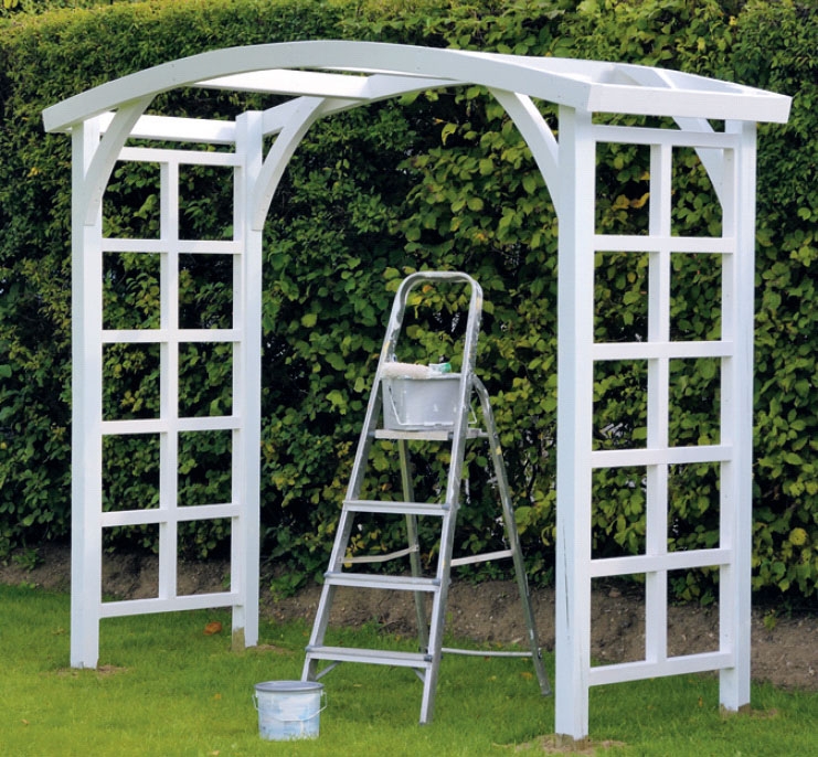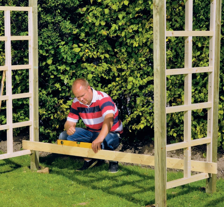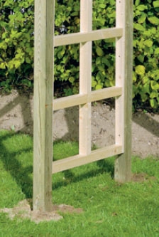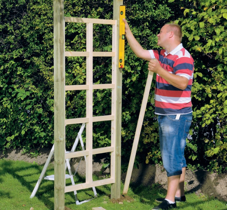Aseta ensimmäinen säleikkö pystysuoraan. Tarkista samalla, että se on kohtisuorassa katoksen pituusakseliin nähden ennen maan tamppaamista. VINKKI: Tamppaa maa tasaiseksi tolppien ympäriltä maan täytön jälkeen.