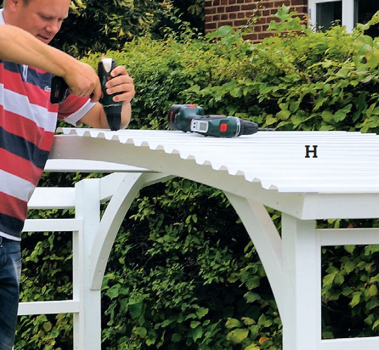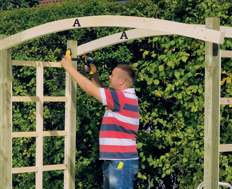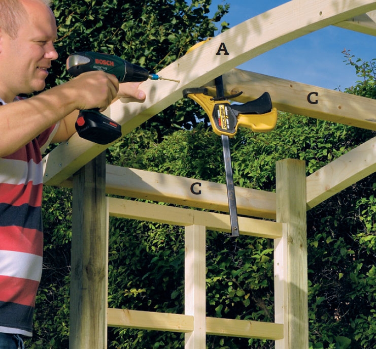 Aseta kattopaarteet (A) oikealle korkeudelle ja kiinnitä ne ruuvi-puristimilla. Kun kulmat ovat kohdillaan, ruuvaa paarteet tolppiin 5 x 100 mm:n ruuveilla. Vinoumat korjaat helposti väliaikaisilla tukirimoilla.
