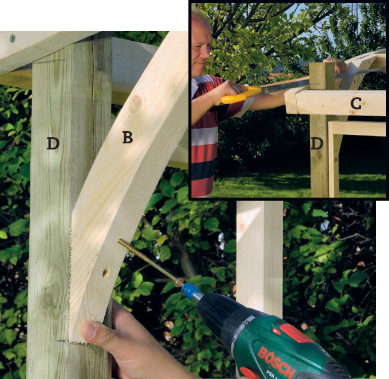 Ruuvaa sahatut vinotuet (B) kiinni. Tolppaan (D) tulee kaksi ruuvia, ylös 6 x 120 mm:n ruuvi ja alas 5 x 70 mm:n ruuvi. Kattopaarteeseen (A) tulee kaksi 5 x 70 mm:n ruuvia.