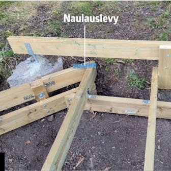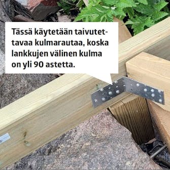 Alle 90 asteen kulmassa olevat lankut yhdistetään toisiinsa käyttämällä naulauslevyjä vähän eri tavalla kuin yleensä. Naulauslevyt ruuvataan kiinni lankkujen päälle. Rautojen päälle asennetaan myöhemmin terassilaudat. Lautoja pitää kaventaa rautojen kohdalta hieman, jotta ne tulevat samalle tasolle muiden lautojen kanssa.