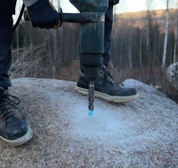 Jos rakennat jotain kalliolle, rakenne pitää ankkuroida kiinni. Tässä näytetään, miten poraat reiän kiveen isolla poravasaralla ja sen jälkeen ankkuroit tolppakengän kaksikomponenttisella ankkurointimassalla.
