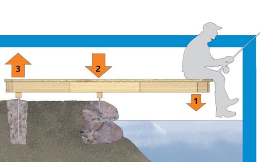IHMISEN PAINO VETÄÄ SILTAA YLÖS Laiturin alussa seisova ihminen painaa rakennelmaa alas-päin tavalliseen tapaan. Kun ihminen istuu laiturin päähän ongelle (1), paino vääntää siltaa ylös taemman perustuksen kohdalta (3), ja laiturin paino jää etummaisen perustuksen varaan (2). Mitä lähempänä laiturin päätä onkija on, sitä kovemmat voimat perustuksiin kohdistuvat.