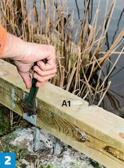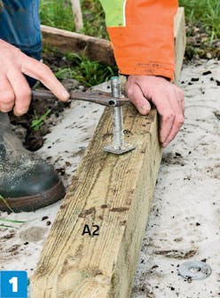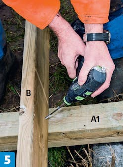Ruuvaa tolppakengät kiinni palkkiin (A1) yhdellä kansi-ruuvilla. Tarkista, onko palkki suorassa. Poraa toista reikää tarvittaessa syvemmäksi.