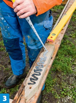 Poraa pilarikenkien reiät 20 millin kiviterällä ja isolla poravasaralla. Poraa reiät samaan linjaan, mahdollisim-man suoraan ja yhtä syviksi.