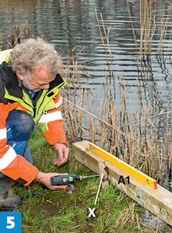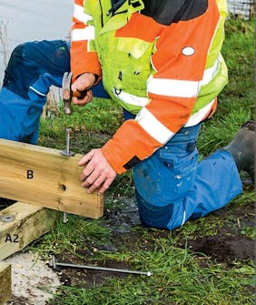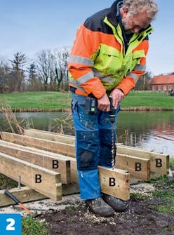 Poraa takapalkkiin tarvittavat reiät ja kiinnitä se betonista nouseviin kierretankoihin. Poraa palkkiin kierre-tankojen reikien lisäksi kuusi reikää laiturin runko lankkujen eli niskojen kierretangoille. Kierretanko ja mutterit kiinnittävät niskat palkkiin lujemmin kuin ruuvit, ja korkeat lankut kestävät äärimmäisen kovaa vääntöä. Kierretangot ja lankut muodostavat yhdessä erittäin vankan rakenteen.