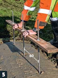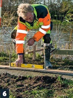 Kiinnittä kierretangot lautaan noin 80 sentin välein ja upota tangot betoniin. Tasoita betonin pinta muurauskauhalla.