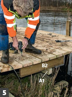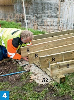 Kiinnitä niskat (B) palkin (A2) alapuolelta levyillä ja mutte-reilla. Keskimmäisten niskojen pitää ulottua pisimmälle, sillä laiturin reuna pyöristetään.