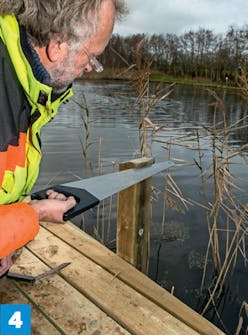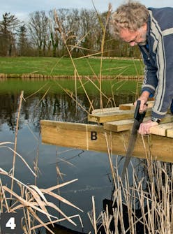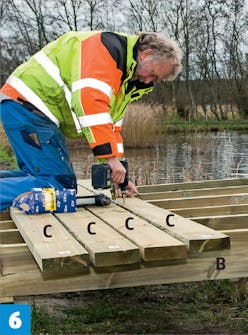 Lyhennä uloimmat niskat (B), jotta ne eivät jää törröttämään laiturin ulkopuolelle. Irrota kansi lankkujen uloimmat ruuvit, ennen kuin katkaiset niskan.