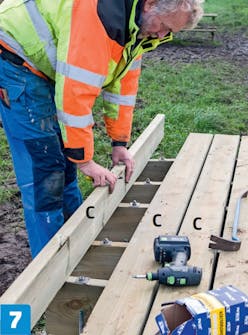 Ruuvaa jokainen kansi lankku (C) kiinni niskoihin (B) kahdella 5x100 millin ruuvilla. Jätä lankkujen väliin noin sentin raot.