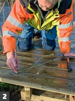Piirrä aluksi pitkät linjat. Kaarien piirtäminen onnistuu pitkän puulistan ja muutaman naulan avulla. Pingota lista kaarelle kolmen tai useamman naulan väliin ja piirrä ääriviivat varovasti laiturin kanteen. Piirtämiseen voi käyttää listan asemesta esimerkiksi sähköjohdon suojaputkea.