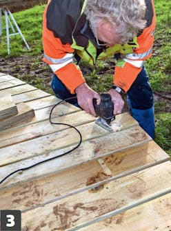 Sahaa kannen reunat pisto-sahalla viivaa pitkin. Lankkujen sahaamisessa riittää työtä, joten varaudu sahaamiseen parilla vaihtoterällä.