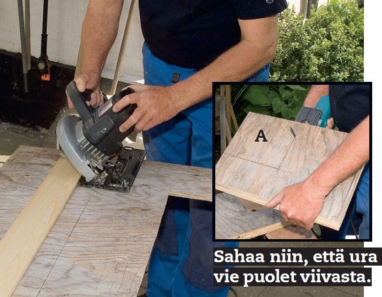 Kaikki osat sahataan vas. sivun piirus-tuksen mukaan. Sivujen (A) yläreunat voi sahata 45°:n kulmaan, jotta ne tukevat kattoa paremmin. Tässä käytämme pyörösahaa, mut ta pistosahakin käy. Sivuissa (A) olevat kulmat voi sahata auki pisto- tai käsisahalla.