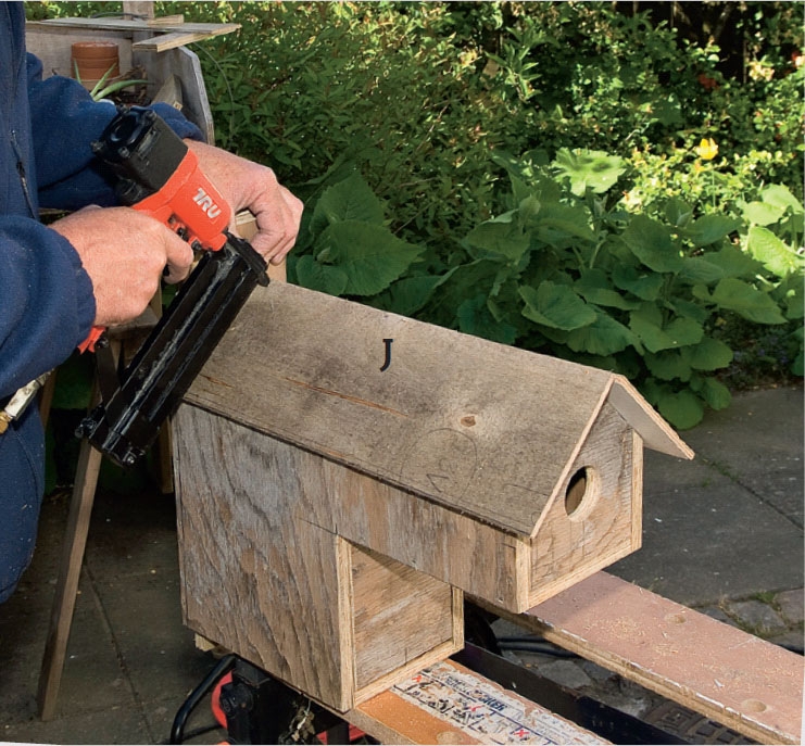 Osat kootaan. Helpoin ja nopein tapa on koota naulaimella, mutta jos sellaista ei ole, käytä nauloja tai ruuveja. 45 mm:n aukko sopii keskikokoisille linnuille, kuten rastaille.