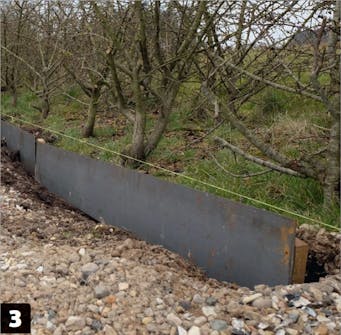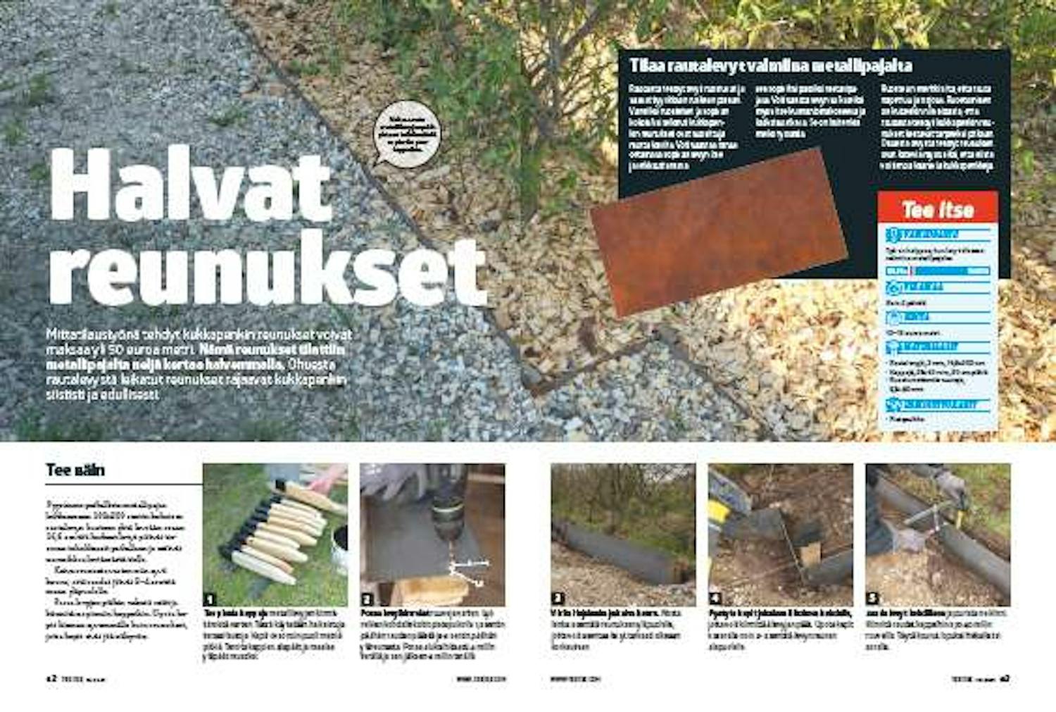Pyysimme paikallista metallipajaa leikkaamaan 100x200 sentin kokoisen rautalevyn kuuteen yhtä leveään osaan. 16,6 senttiä korkeat levyt pitävät tie soran tehokkaasti paikallaan ja estävät nurmikkoa leviämästä tielle.