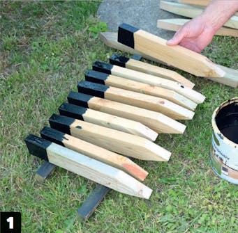 Tee pieniä keppejä metallilevyjen kiinnittämistä varten. Tässä käytetään halkaistuja terassilautoja. Kepit ovat noin puoli metriä pitkiä. Teroita keppien alapäät ja maalaa yläpäät mustiksi.