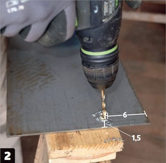 Poraa levyihin reiät ruuveja varten. Lyö reikien kohdalle kolot pistepuikolla 1,5 sentin päähän raudan päästä ja 6 sentin päähän yläreunasta. Poraa aluksi hitaasti 4 millin terällä ja sen jälkeen 6 millin terällä.