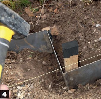 Viritä linjalanka ja kaiva kouru. Nosta lanka 5 senttiä reunuksen yläpuolelle, jotta voit asentaa levyt tarkasti oikeaan korkeuteen.