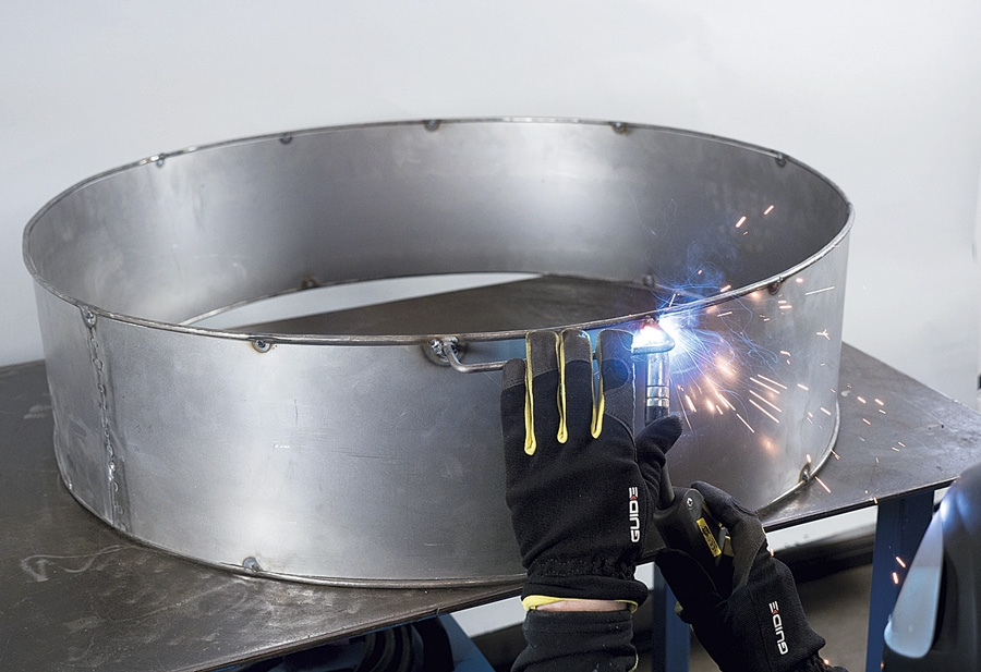 Teräslevyt asetetaan peräkkäin, taivutetaan ympyrän muotoon, puristetaan yhteen ja hitsataan kiinni toisiinsa. Tässä käytetään sähköhitsauslaitetta, joka sopii kevyeen työhön ja on paljon halvempi kuin TIG ja MIG/MAGhitsauslaitteet. Ellei sinulla ole hitsauslaitteita etkä halua ostaa niitä, voit vuokrata laitteet konevuokraamosta. Muista aina käyttää oikeita suojavarusteita, kun hitsaat.
