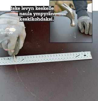 Piirrä levyyn ympyrä valumuotin syvennystä varten. Kiinnitä levyn keskelle naula ja siihen viivotin. Viivaimeen on tehty reikä, josta naula työntyy läpi. Viivainta pyöritettäessä naula raapii ympyrälinjan. Voit käyttää myös narua viivaimen sijaan.