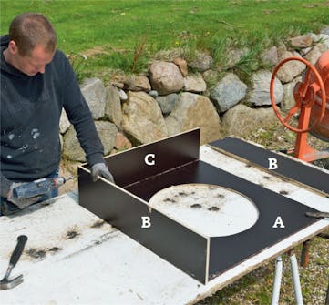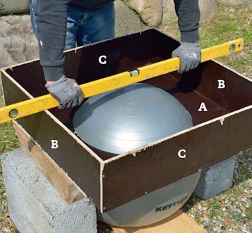 Kokoa muotti, kun olet sahannut kaikki osat. Neljä sivua (B ja C) kiinnitetään toisiinsa ja pohjakappaleeseen (A) 4 x 40 mm ruuveilla. Kun muotti on koottu, nosta se korotetulle alustalle.