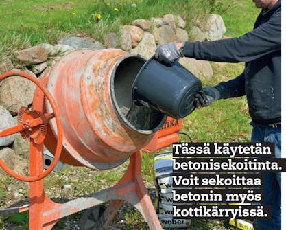 Sekoita betoni, kun muotti on valmis. Käytettävän betonin vahvuuden tulee olla 30 MPa. Jos käytät kuivabetonia, kuten esimerkissä, ohje löytyy paketista. Kuivabetonia on helppo käyttää, sillä siihen lisätään vain vesi. Näin voit olla varma, että sekoitussuhde on oikein.