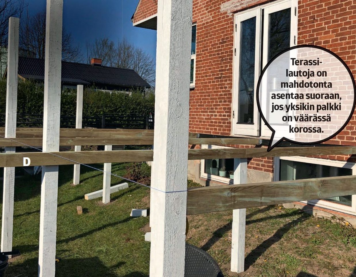 Kun poikkipalkit (D) on asennettu, tarkista vielä kerran, että ne ovat samassa korossa. Käytä palkkien asentamiseen 5x100 millin galvanoituja ruuveja.