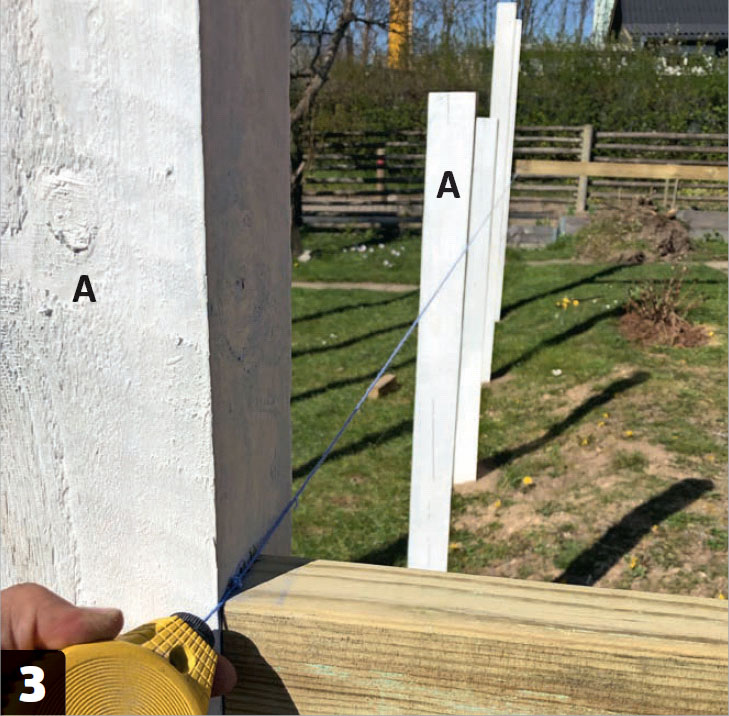 Pystytä ensimmäinen tolppa (A). Tarkista vatupassilla, että se on suorassa syvyys- ja leveyssuunnassa. Tue tolppa pystyyn parilla vinotuella valamisen ajaksi.