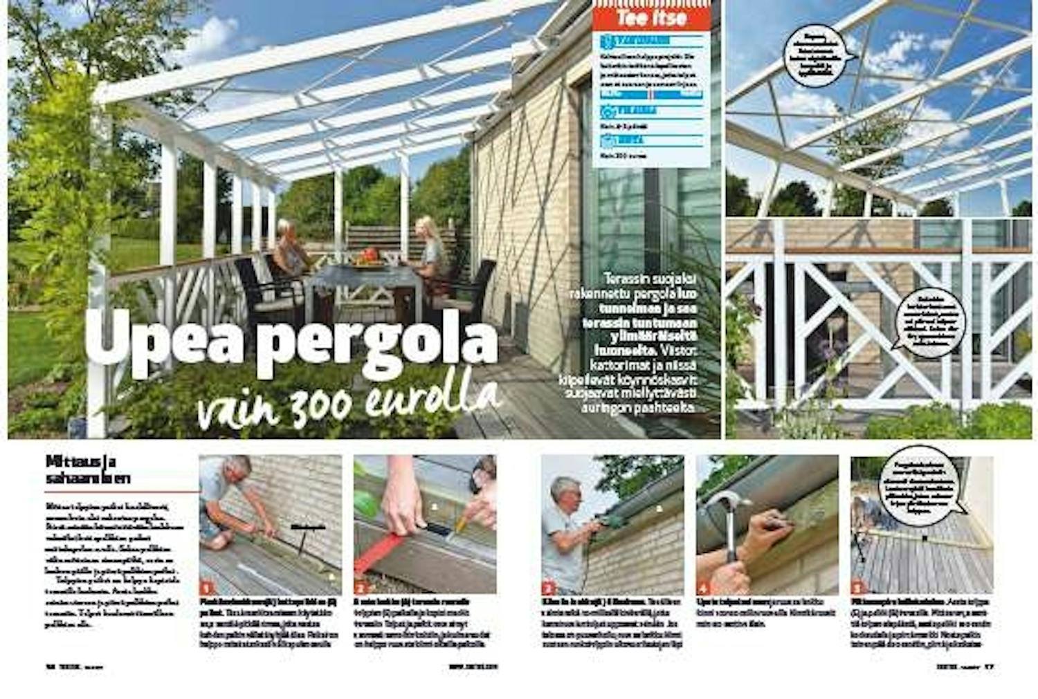 Mittaa tolppien paikat huolellisesti, ennen kuin alat rakentaa pergolaa. Piirrä seinään kiinnitettävään lankkuun valmiiksi kattopalkkien paikat mittakapulan avulla. Sahaa palkkien välin mittainen rimanpätkä, aseta se lankun päälle ja piirrä palkkien paikat.