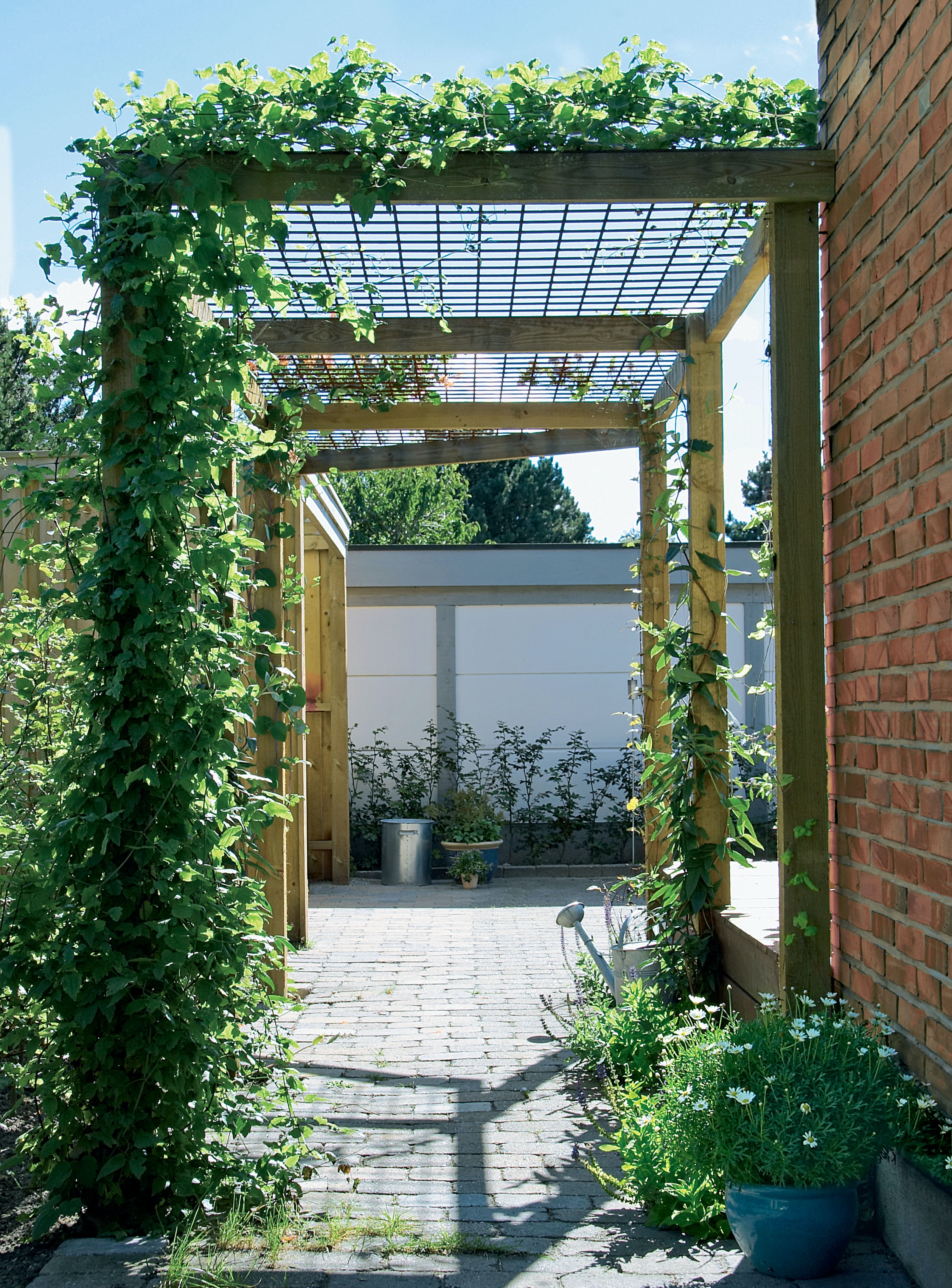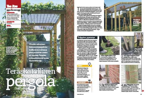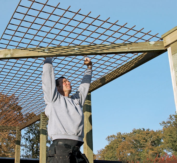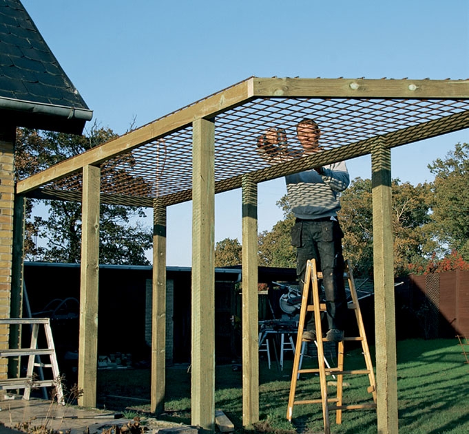 Painavat tolpat ja raskas verkko tekevät työstä vaati-van. Mutta jos vertaa työpa-noksen suuruutta pergolan luomaan vaikutelmaan, projekti ei ole liian vaikea.