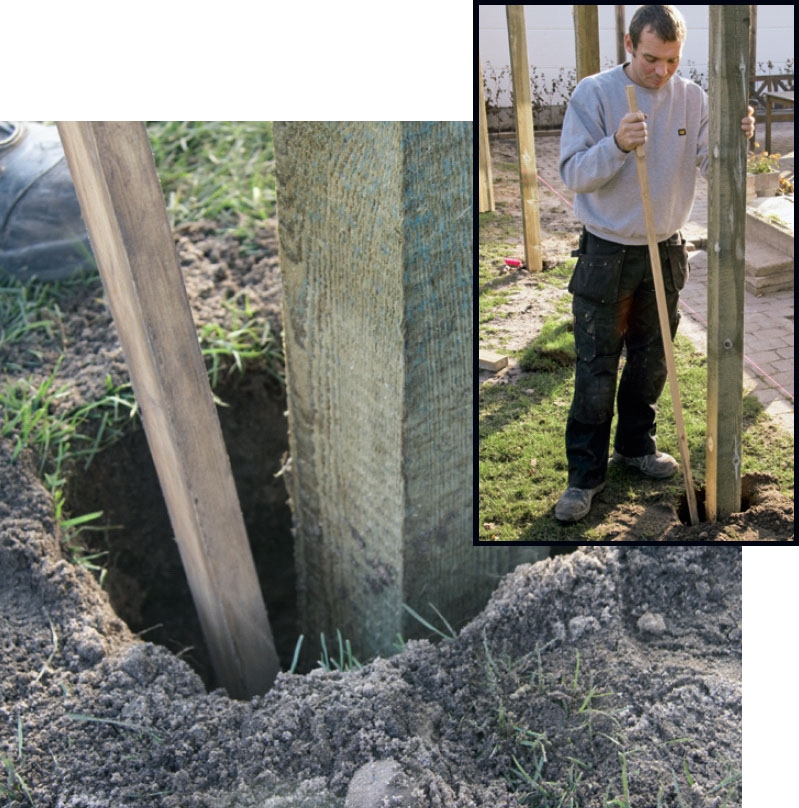 Aseta tolppa kuoppaan lyötyyn teräsjalkaan ja täytä kuoppa vähitellen tolpan ympäriltä. Tamppaa maa kuoppaa täyttäessäsi. Jos valat tolpat kiinni, pidä niitä paikoillaan muutamien puristi-mien avulla kunnes betoni on kovettunut.