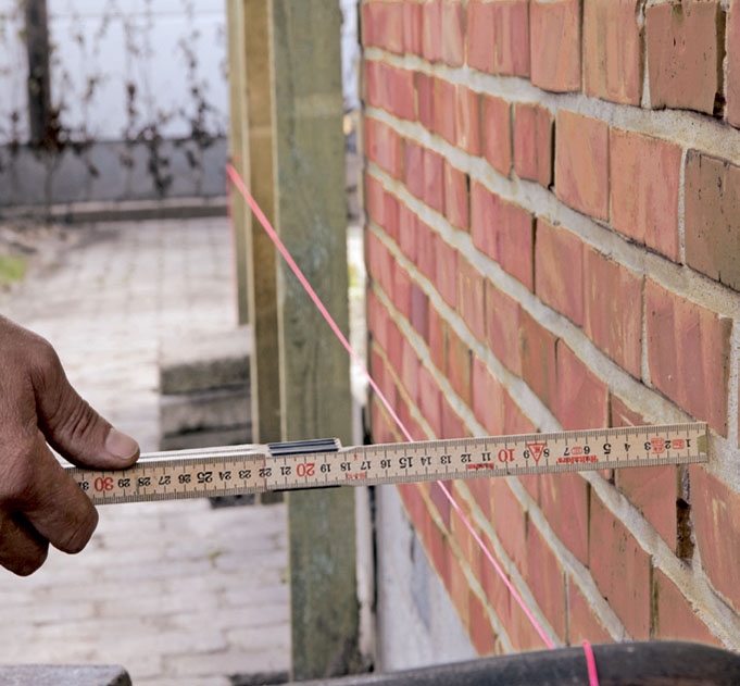 Tolpat oikaistaan linjaan narun avulla. Naru sidotaan tiiliseinän saumaan lyötyyn naulaan ja toisessa päässä ensimmäiseen runkotolppaan. Loput tolpat oikaistaan tämän mukaan.