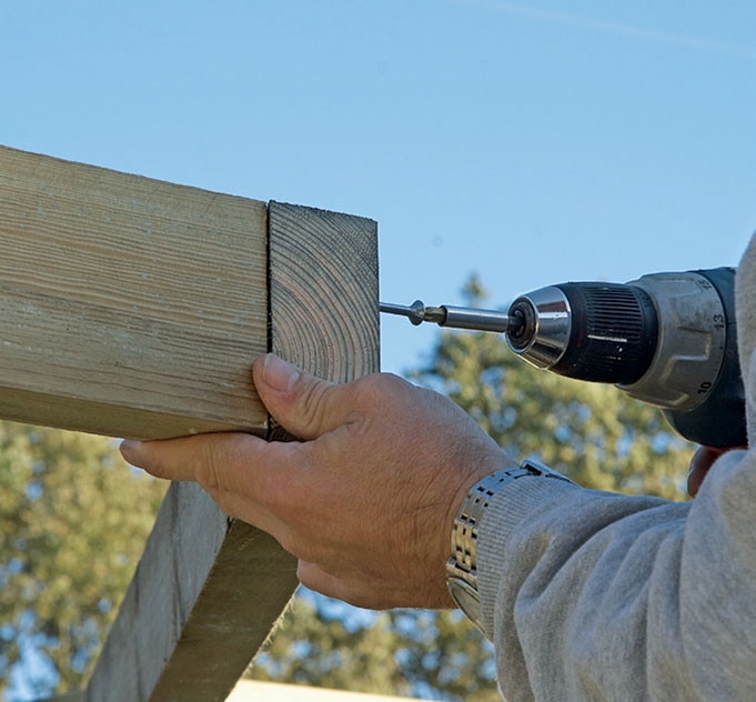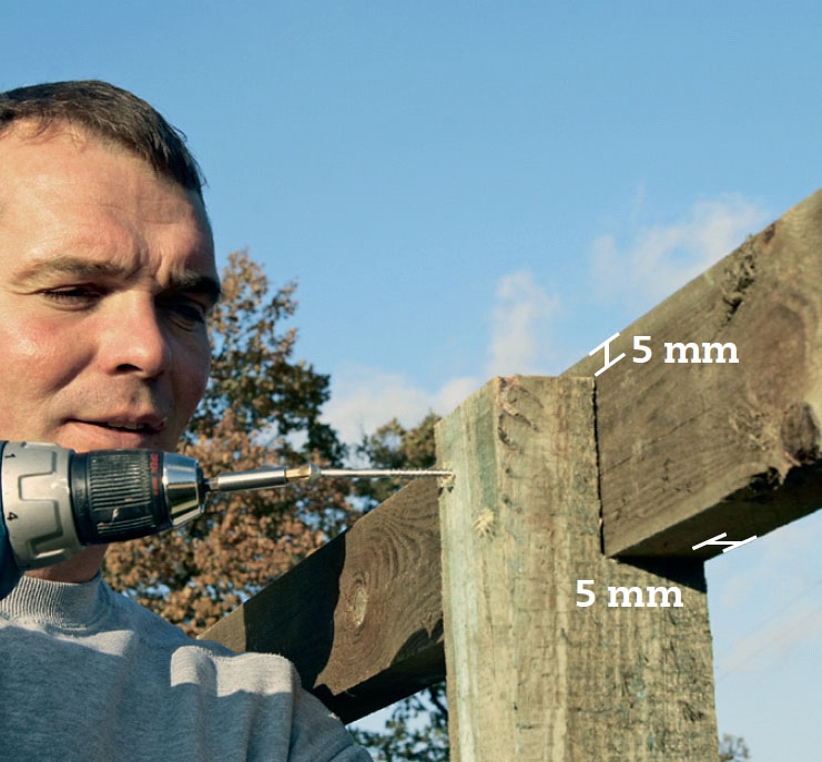Viistokulma ruuvataan kiinni. Muista esiporata, jotta puu ei halkea. Käytä jälleen 6 x 90 mm:n ruuveja. Kaksi viimeistä poikkipalkkia saavat odottaa sovittamista ja kiinnittämistä, kunnes verkko on leikattu ja asetettu paikoilleen.