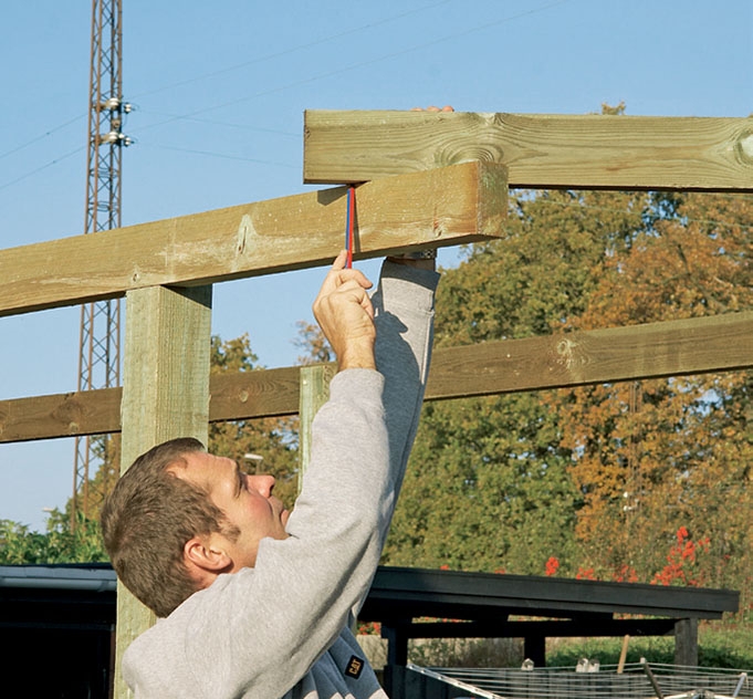 Poikittain kulkevat irtopalkit asetetaan lopuksi raamin väliin. Vain yksi jokaista 150 cm kohti, jotta pergolan ilme säilyy mahdollisimman kevyenä. Pergola on valmis kasveja varten. Puunsuojauksella voidaan lisätä pergolan kestävyyttä.