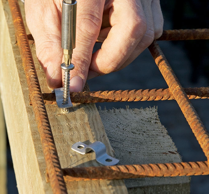 Raami kiinnitetään ruostumat-tomilla ruuveilla (6 x 90 mm), sillä painekyllästysaine ruostuttaa tavalliset ruuvit. Esiporaa raamiin ruuvinreiät 6 mm:n poranterällä, elleivät ruuvit ole itsesenkkaavia malliltaan.