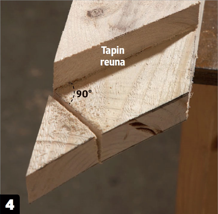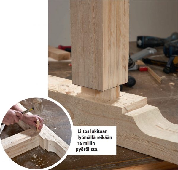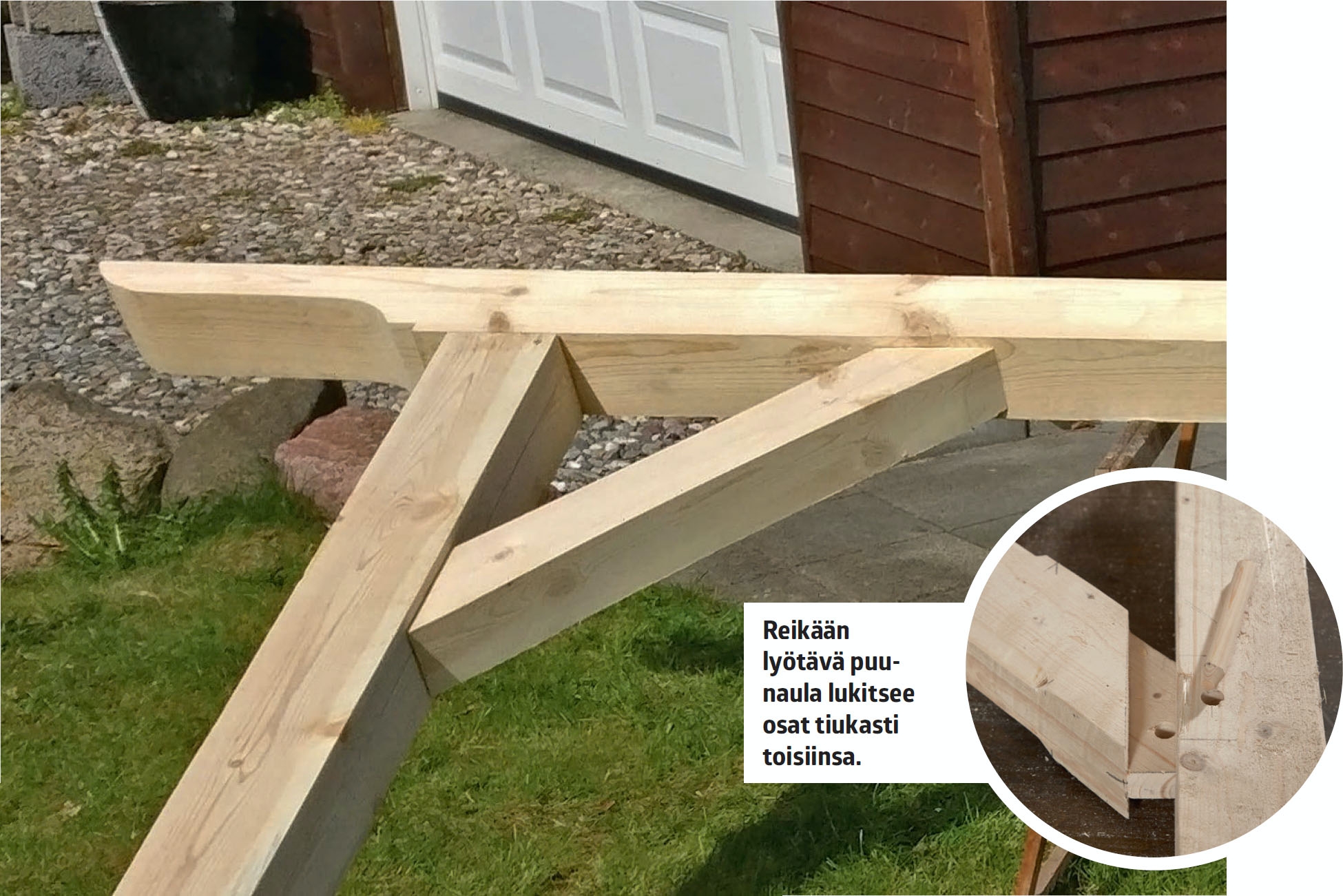 Tämä perinteinen puuliitos on lujempi kuin mikään kulmarauta. Poikittain upotettava puunaula tekee liitoksesta vielä vahvemman.