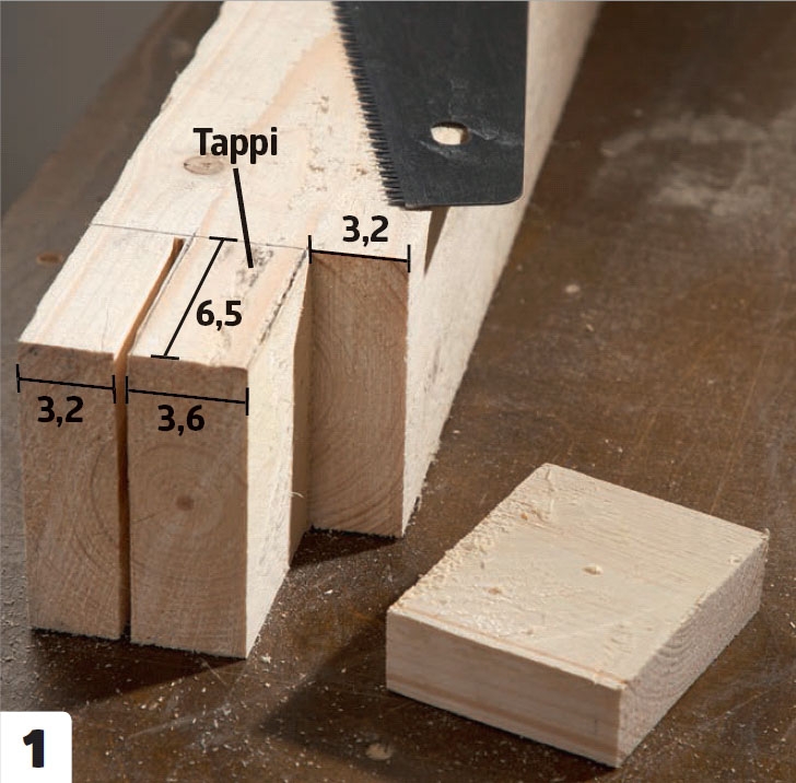 Sahaa tolpan molemmilta puolilta pois 32 milliä leveä pala. Sahaa merkkiviivan ulkopuolelta, jotta tapista tulee juuri oikean kokoinen.