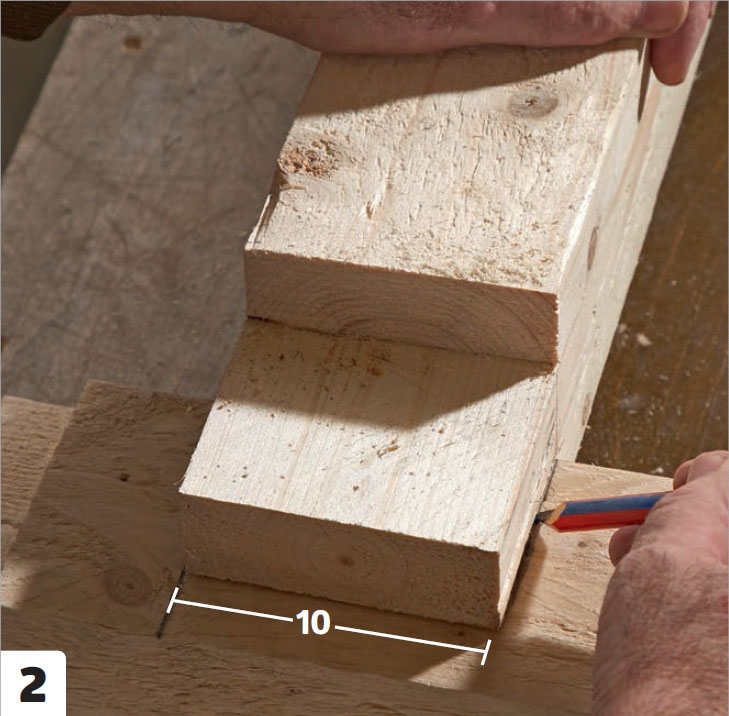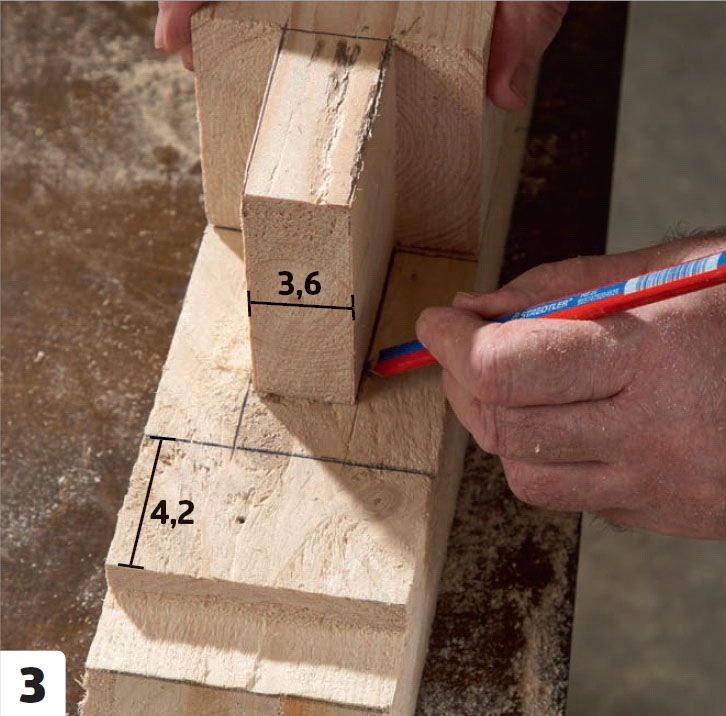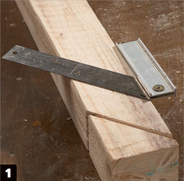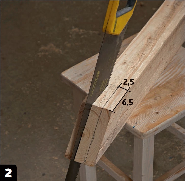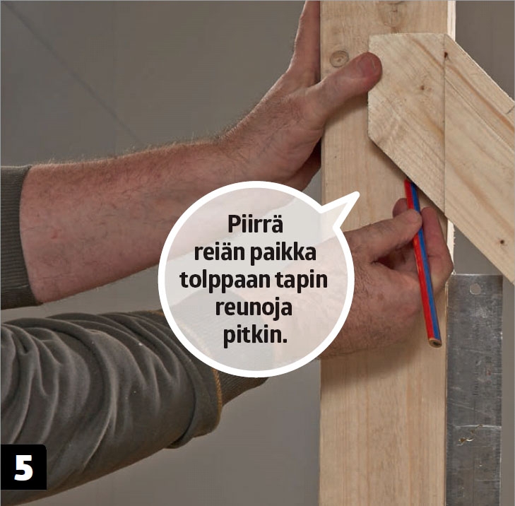 Sahaa vinotuen päät 45 asteen kulmassa. Pidä vinotukea oikealla paikallaan ja piirrä merkkiviivat.