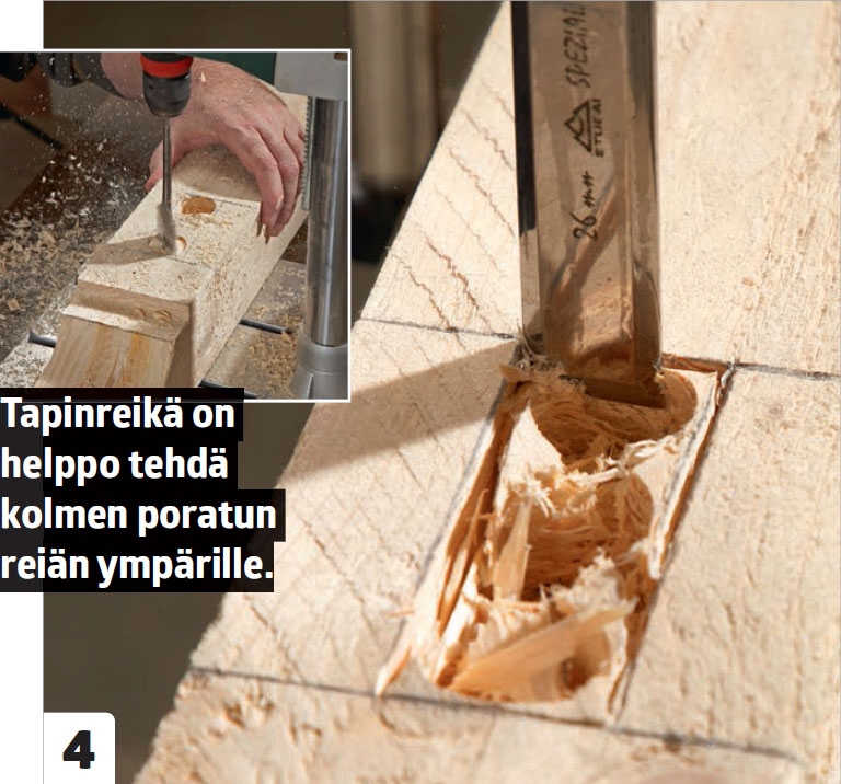Poraa puuta reikäsahalla. Terän pitää vain upota puuhun, ei irrottaa palasta. Reikäsaha uppoaa puuhun noin kolme senttiä kerrallaan.