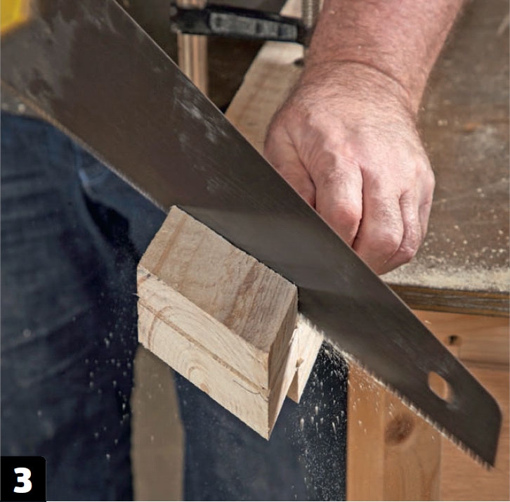 Aloita sahaamalla vinotuen molemmat päät 45 asteen kulmassa. Tee tapit valmiiksi, ennen kuin aloitat tapinreikien tekemisen.