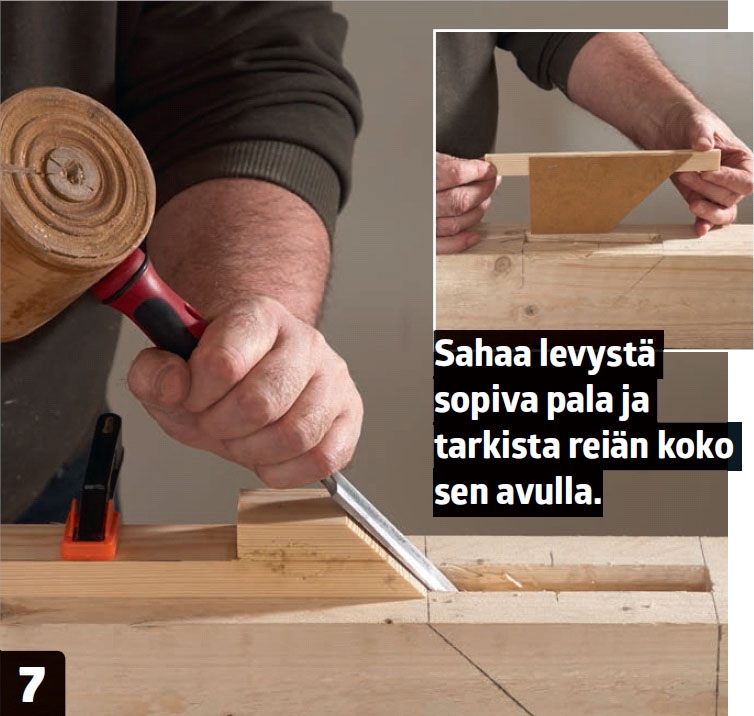 Piirrä tapinreikä. Viivoitettu osa veistetään pois 45 asteen kulmassa. Ympärillä olevan alueen voi porata pois 28 millin lattaterällä. Siisti kolon pystysuorat osat taltalla sen jälkeen, kun olet porannut niihin reiät.