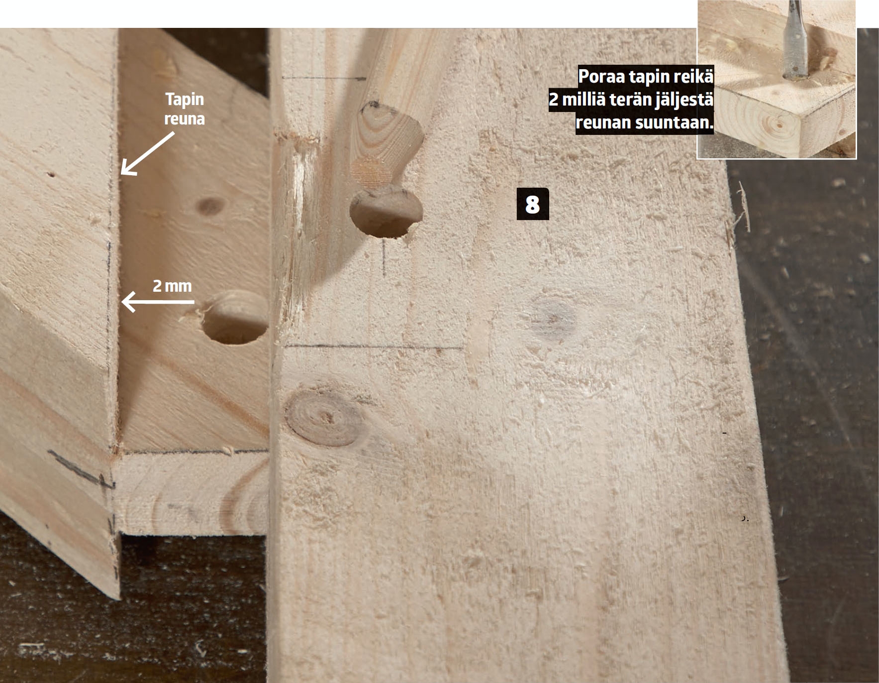 Tolpan tappi ulottuu yläpuuhun 6,5 sentin syvyyteen. Tapin leveyden pitää olla vähintään 1/3 tolpan leveydestä. Tapista tulee 36 milliä leveä, joten sille voi porata reiän 35 millin lattaterällä.