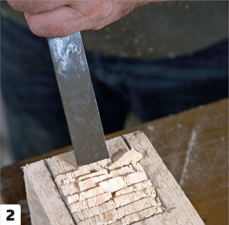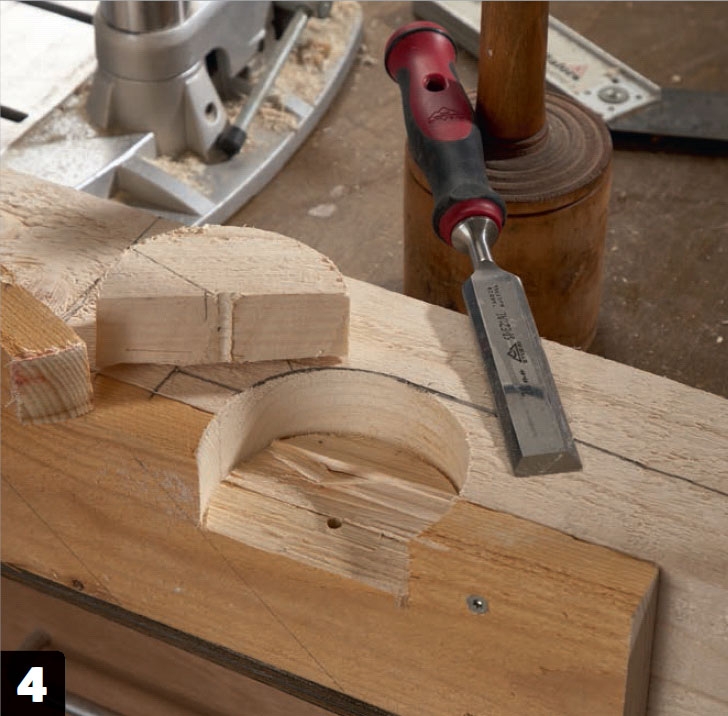 Veistä pois viivoitettu alue. Aloita silmä-määräisesti ja lyö talttaa reiän pystysuoraa reunaa kohti. Tee puusta kapula, jossa on 45 asteen kulma. Käytä sitä ohjaimena kuvassa näkyvällä tavalla.