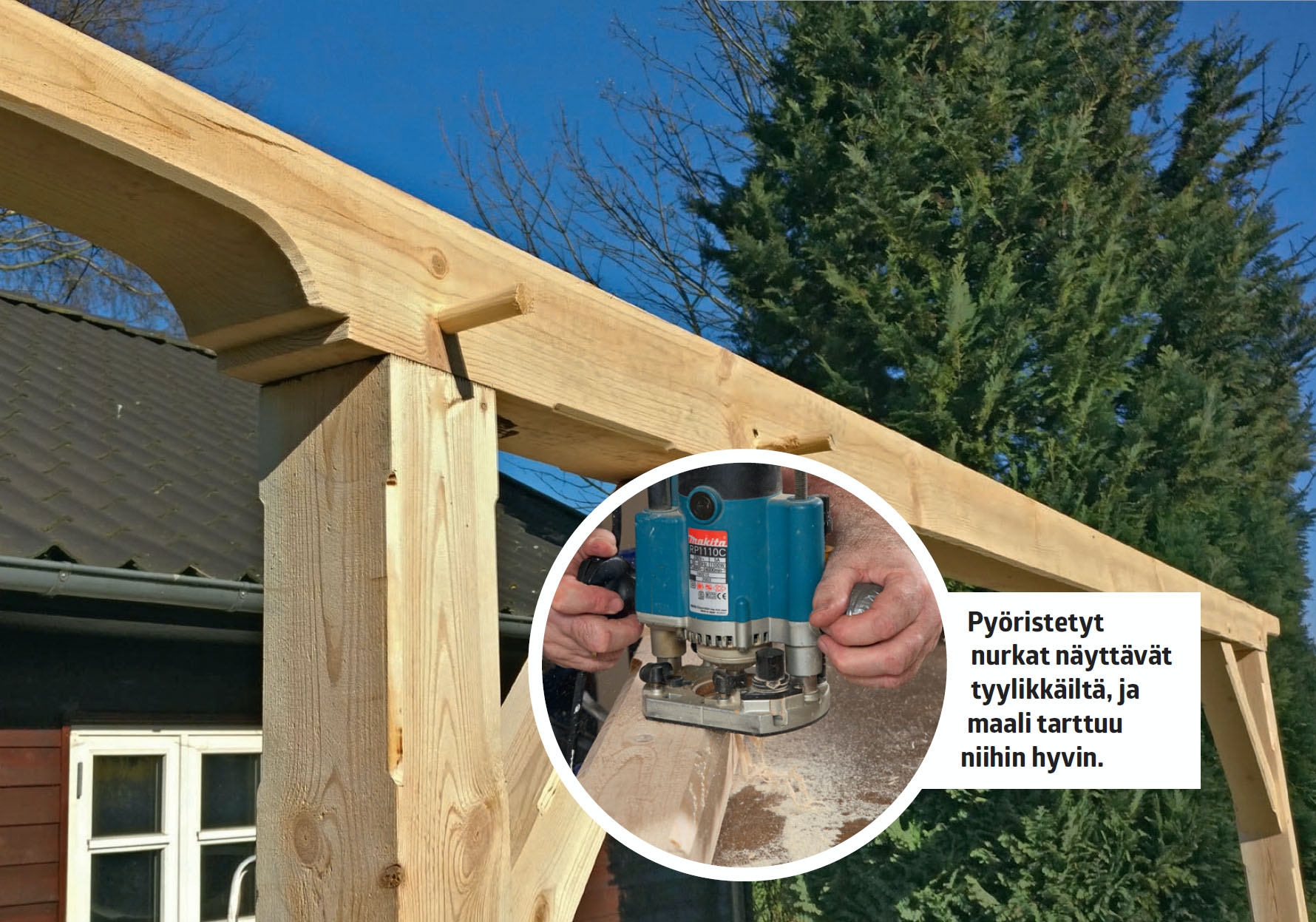 Pyöristetyt tolpat näyttävät kevyemmiltä kuin terävänurkkaiset tolpat. Tämän pergolan tolpat pyöris-tetään vain yläpäästä.