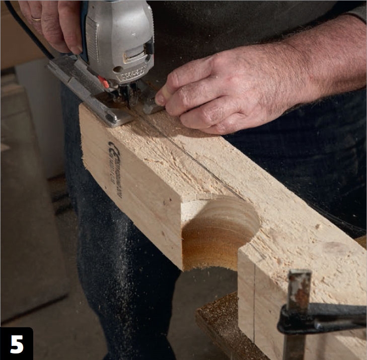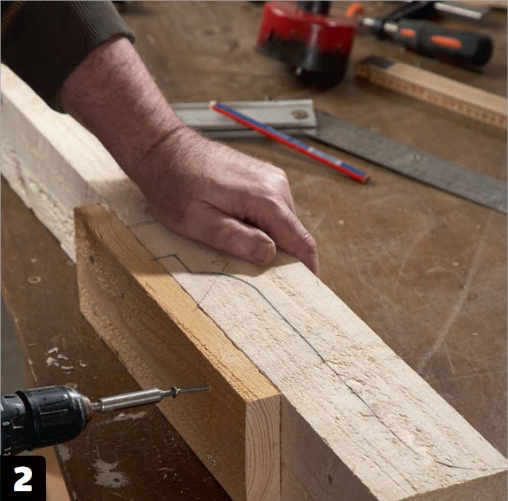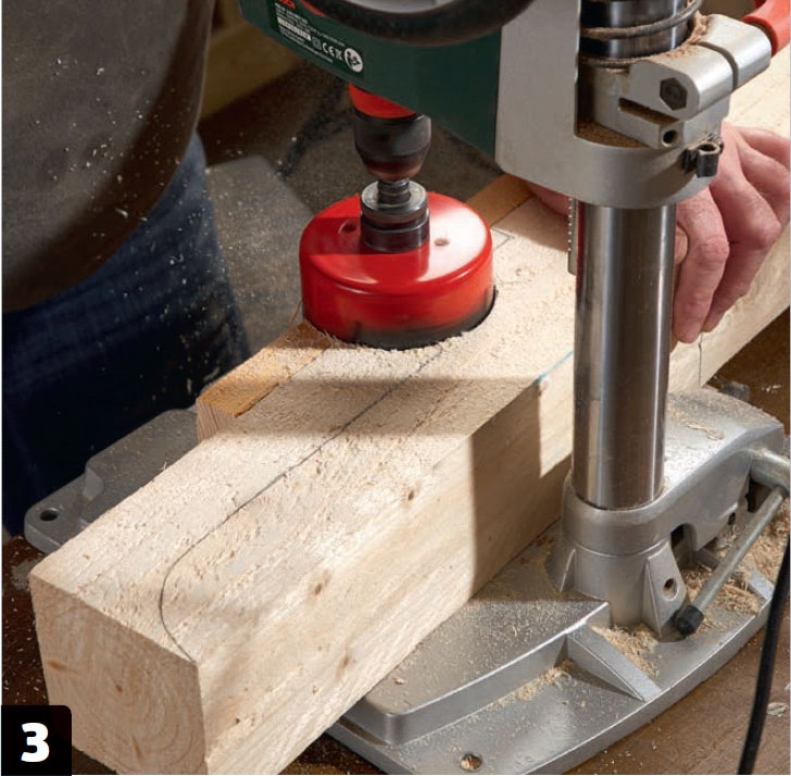 Ruuvaa 19x100 millin lauta kiinni tolpan reunaan. Lauta auttaa pitämään reikäsahan paikallaan, kun sillä tehdään pyöristys tolppaan.