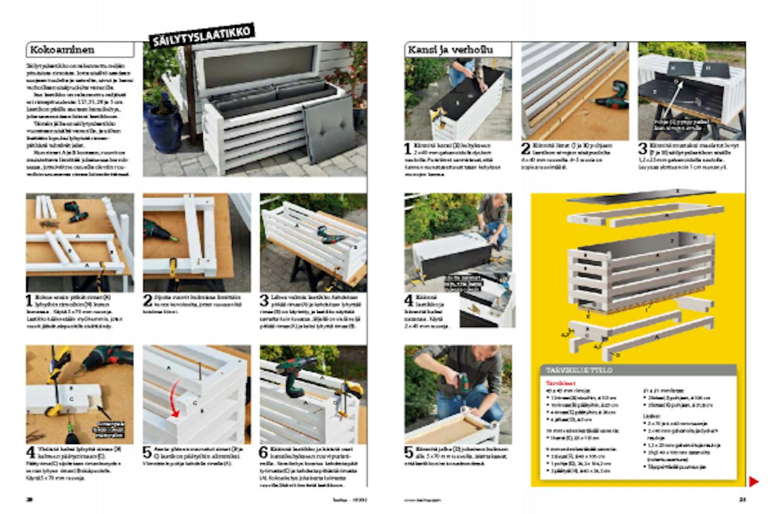 Säilytyslaatikko on rakennettu neljän pituisista rimoista. Jotta sisältö saadaan suojaan tuulelta ja sateelta, sivut ja kansi verhoillaan sisäpuolelta vanerilla.