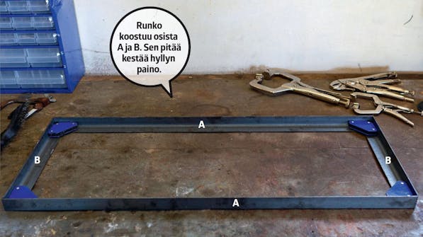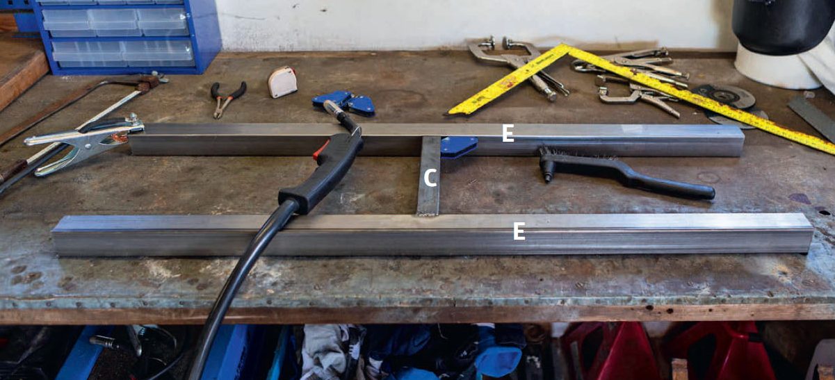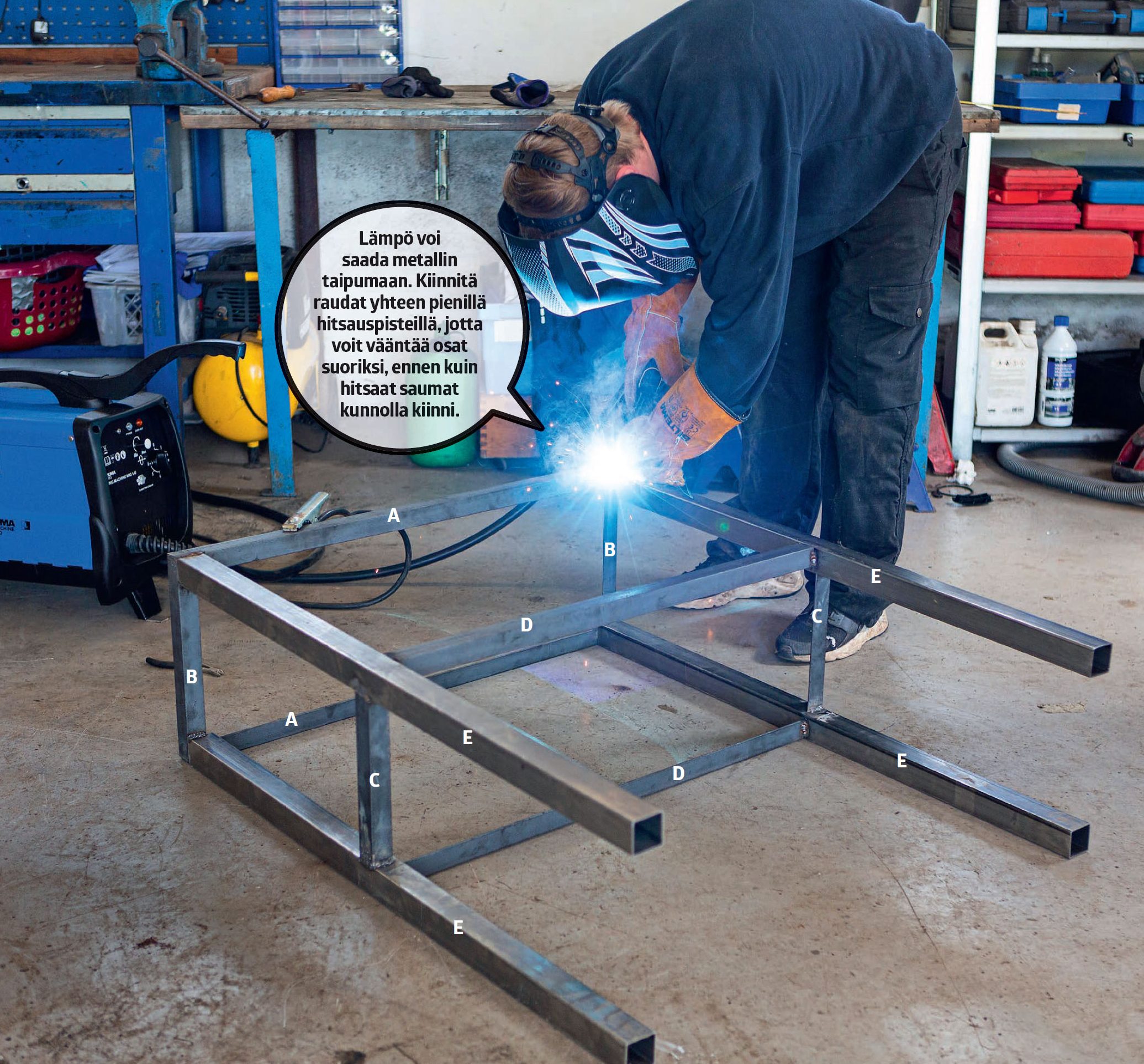Nyt on aika yhdistää osat. Hitsaa kehikko kiinni jalkoihin. Hitsaa pitkät poikkituet (D) kiinni samalla tavalla kuin lyhyet poikkituet (C).