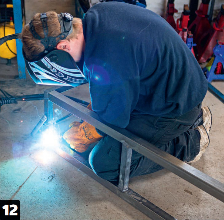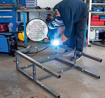 Hitsaa kehikko kiinni jalkoihin yksi pääty kerrallaan. Kiinnitä osat aluksi pienillä hitsauspisteillä. Sen jälkeen voit vääntää osat paikoilleen ja suoriin kulmiin.
