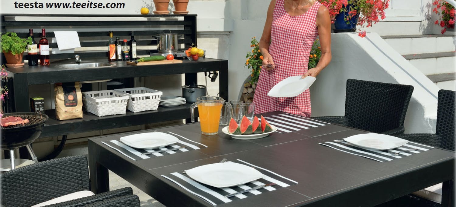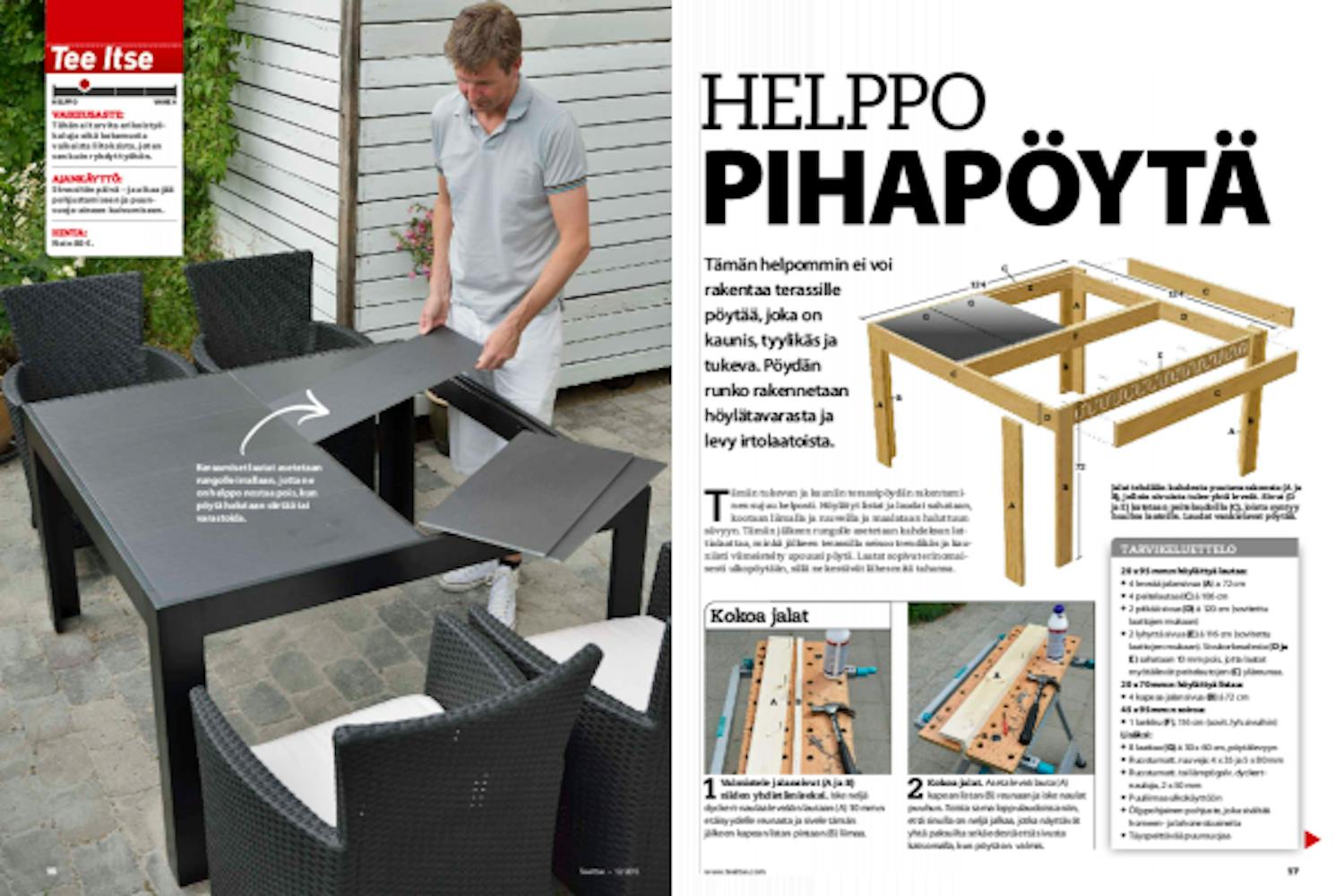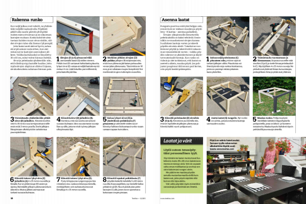 Sivujen ulkopinnoille liimattavilla peitelaudoilla on kaksi tehtävää. Ensin-näkin ne muodostavat sivujen kanssa huulloksen laattoja varten ja tekevät pöydän sivuista siistit. Toiseksi ne vankistavat pöytää ja tekevät siitä vakaam-man terassielämää varten - vaikka pöy-dän rakenne on yksinkertainen ja käyte-tyt materiaalit hentoja. Kun runko on valmis ja olet tarkistanut, että laatat on asetettu oikein, maalaa pöy tä. Jos poh-justat puupinnat tätä ennen pari kertaa, niin pöytä kestää pidempään.