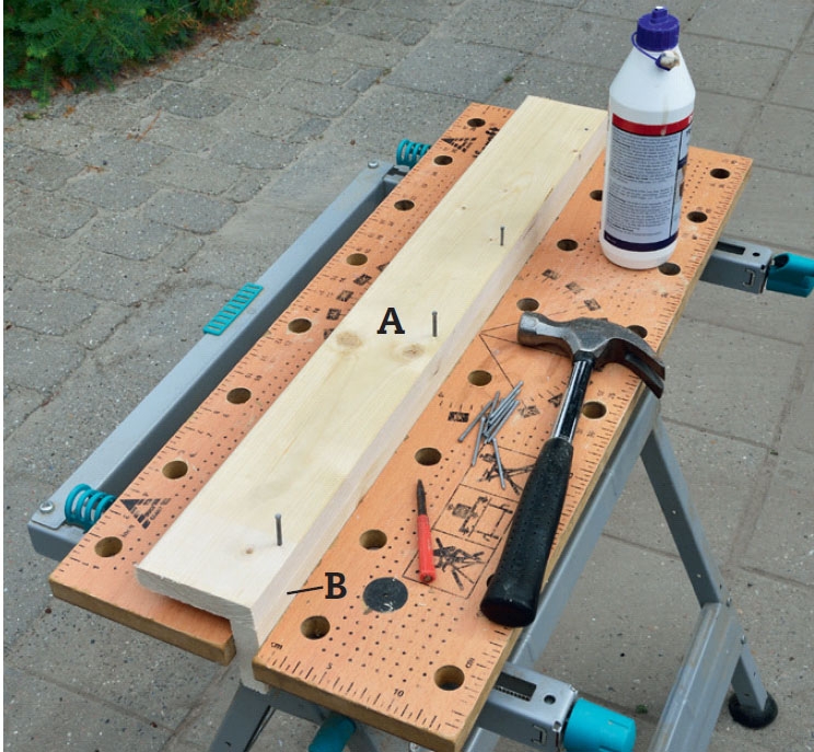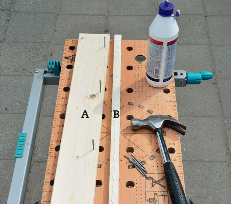 Valmistele jalansivut (A ja B) niiden yhdistämiseksi. Iske neljä dyckert-naulaa leveään lautaan (A) 10 mm:n etäisyydelle reunasta ja sivele tämän jälkeen kapean listan pintaan (B) liimaa.